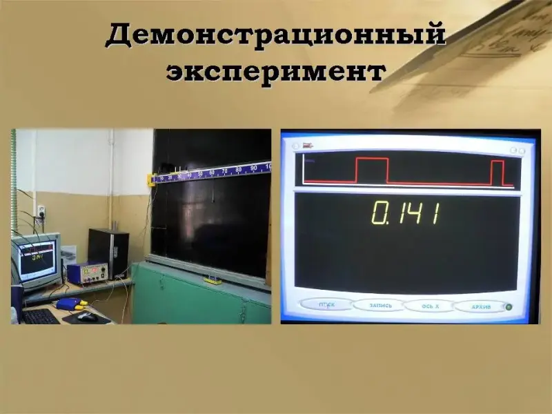 В нашем случае датчики будут передавать сигнал на компьютерный измерительный блок. На экране при помощи мультимедийного проектора мы будем наблюдать передаваемый сигнал и значение измеренного времени.