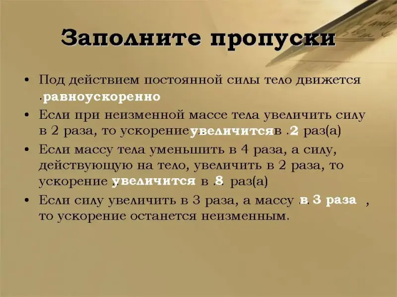 - Если при неизменной массе тела увеличить силу в 2 раза, то ускорение увеличится в 2 раз(а)