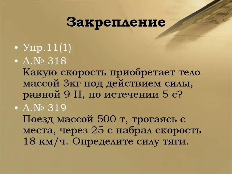 Какую скорость приобретает тело массой 3кг под действием силы, равной 9 Н, по истечении 5 с? - Л. 319