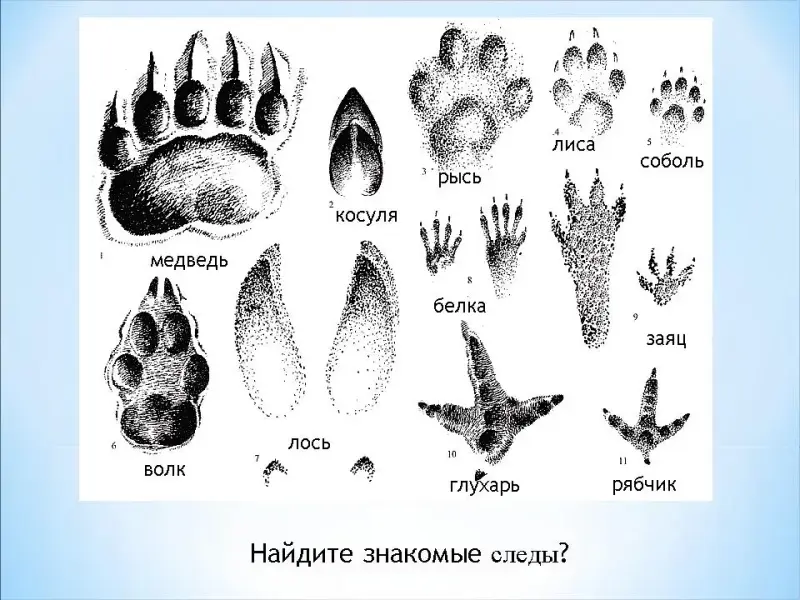 Задание. Найдите знакомые следы.( Слайд 16) (Работа в парах. Ответы: 1. Медведь, 2. Косуля, 3. Рысь, 4. Лиса, 5. Соболь, 6. Волк, 7. Лось, 8. Белка, 9. Заяц, 10. Глухарь, 11. Рябчик)