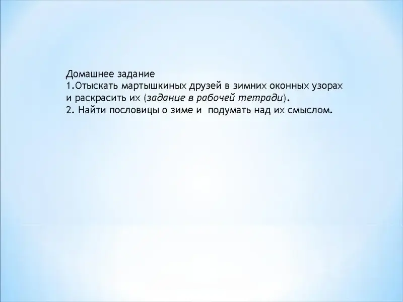 - Я предлагаю вам выполнить дома творческое задание, которое развивает внимание. Постарайтесь отыскать мартышкиных друзей в зимних оконных узорах, раскрасьте их (задание в рабочей тетради). А кто хочет выполнить задание потруднее, вы можете найти пословицы о зиме и подумать над их смыслом. (Слайд 18)