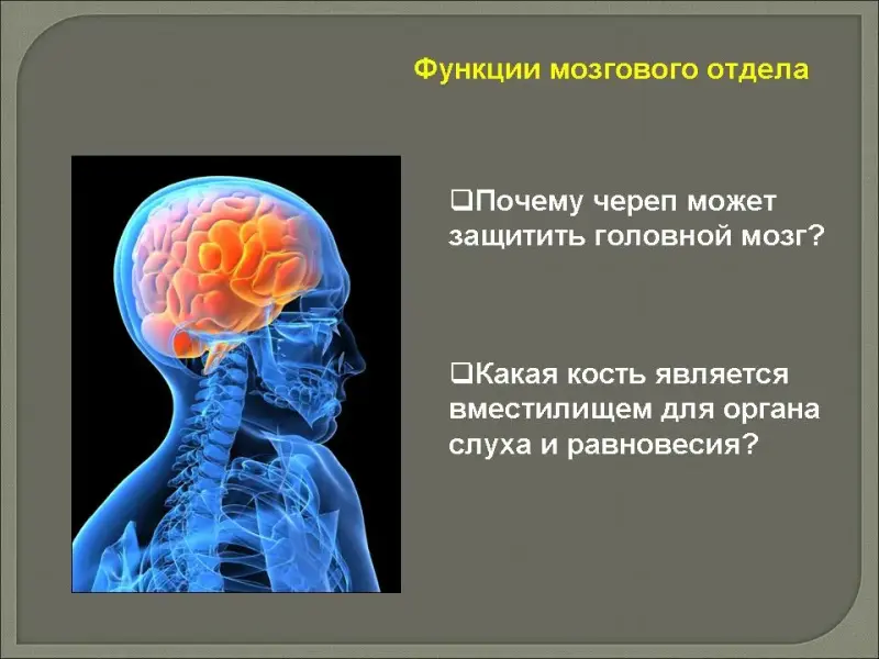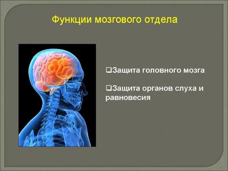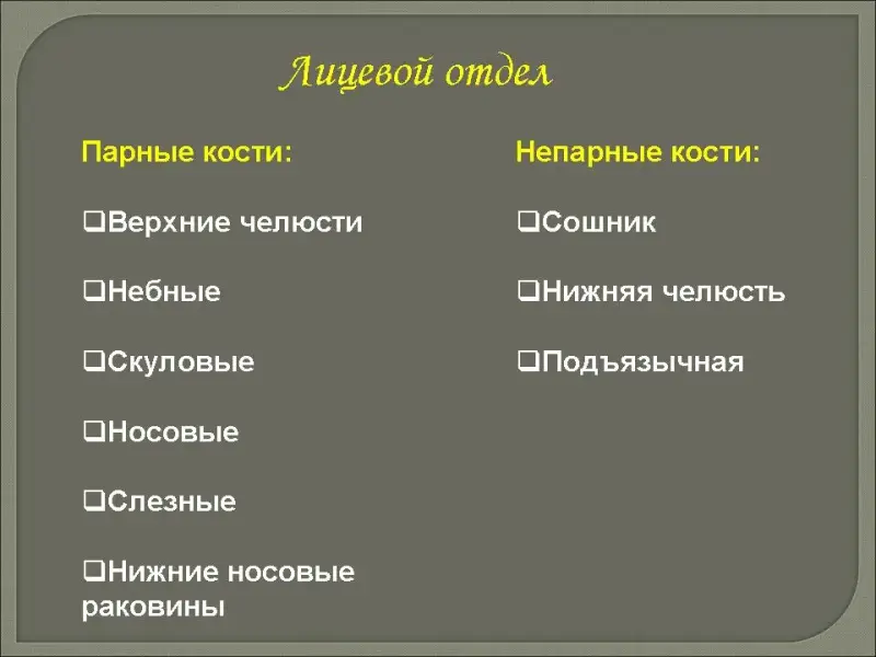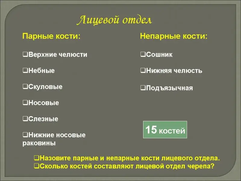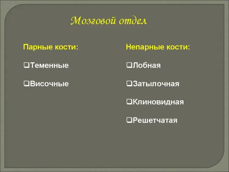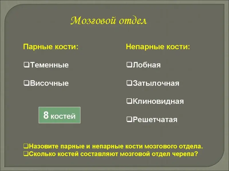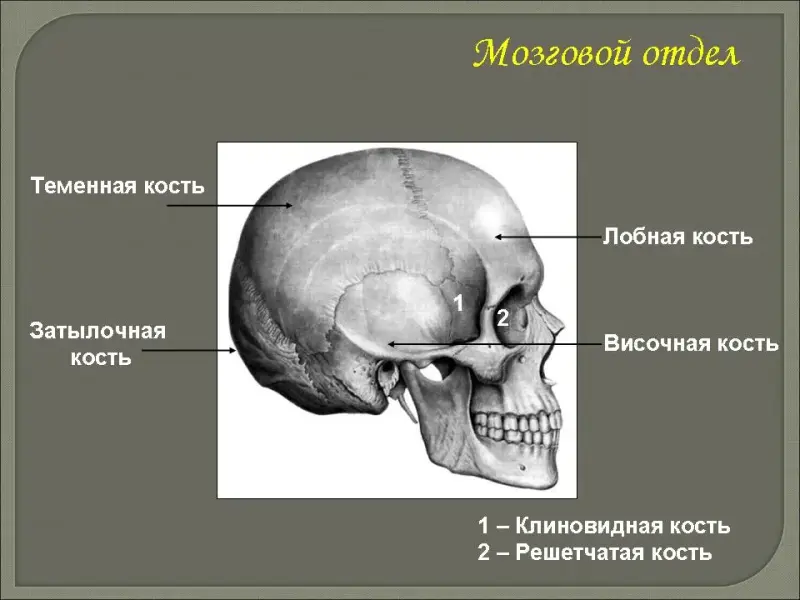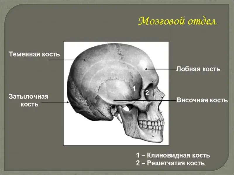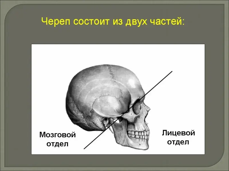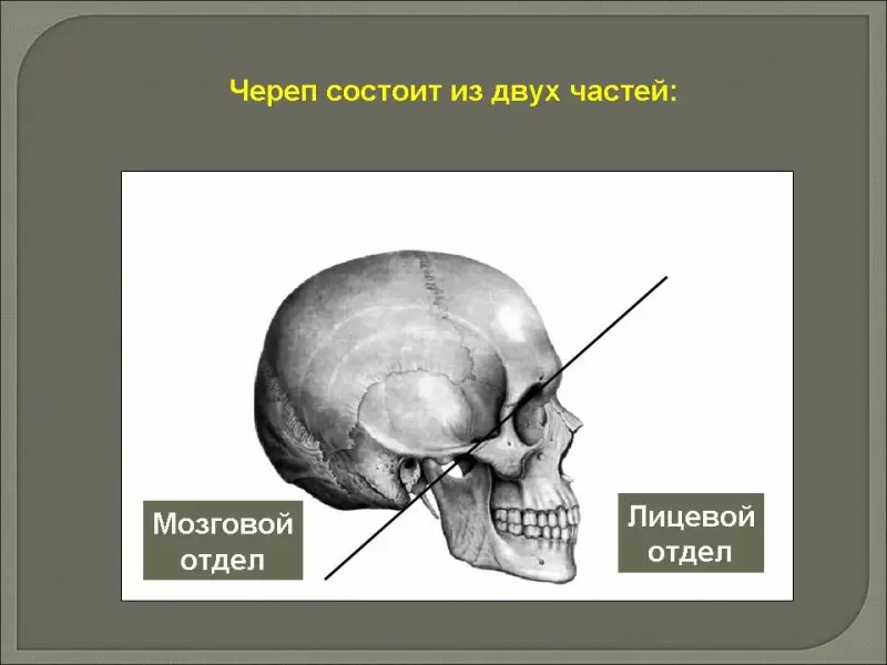 - 2 части черепа: мозговой отдел и лицевой отдел.