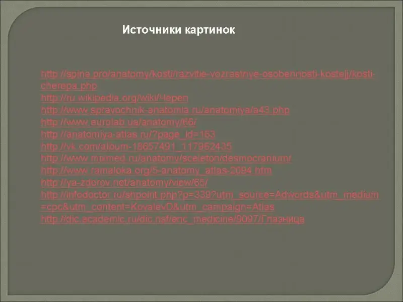 Иллюстративный материал (фотографии, рисунки, схемы), текст каждого слайда содержат сжатую информацию о строении и развитии черепа.