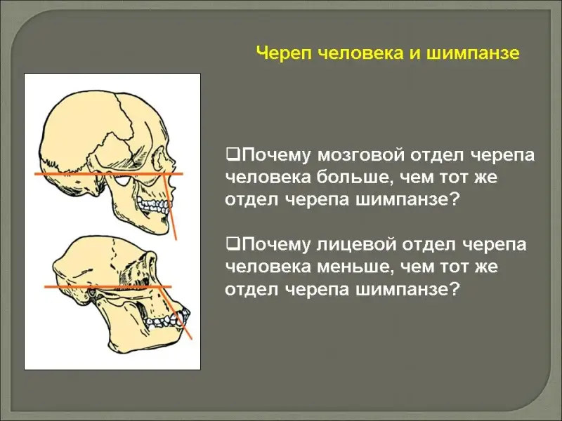 - Научить учащихся узнавать и называть кости черепа человека, рассматривать строение скелета головы в развитии, отличать неподвижное соединение костей от суставов, выделять отличительные признаки черепа человека и шимпанзе, выделять характерные признаки плоских костей.