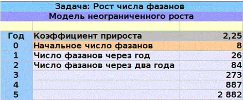 Сформулируем задачу. В 1937 г. на остров Протекшн завезли 8 фазанов. Никто на этих фазанов не охотился (ни люди, ни звери), корма и воды было вдоволь, и через год фазанов стало 26, а еще через год их было 83. Сколько будет фазанов через заданное число лет?