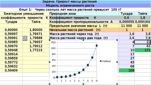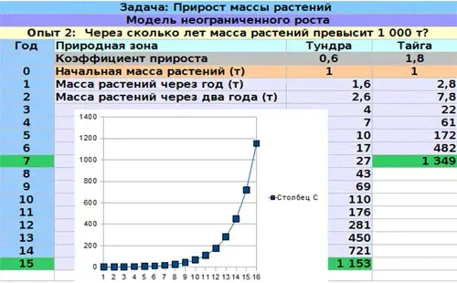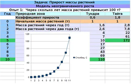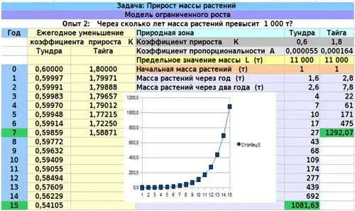 | 2 | Опыт 2: Через сколько лет масса растений превысит 1000 т? | 15 лет | 7 лет | |||