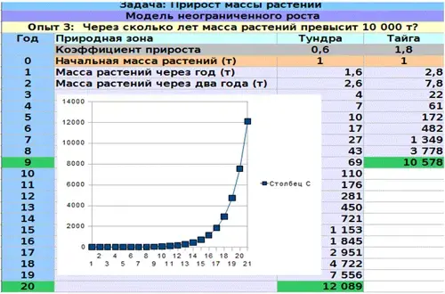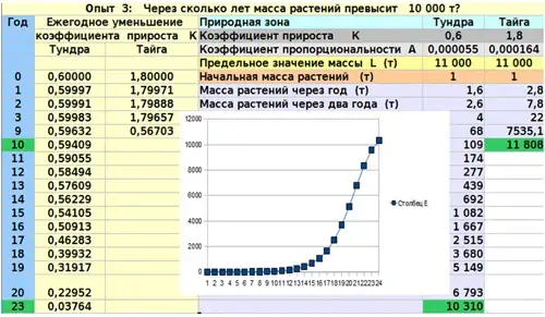 | 3 | Опыт 3: Через сколько лет масса растений превысит 10 000 т? | 20 лет | 9 лет | |||