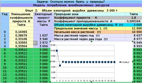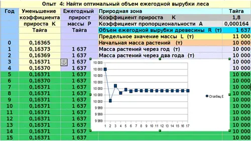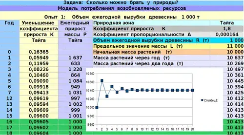 | 1 | Опыт 1: Объем ежегодной вырубки древесины 1 000 т | Через определенный промежуток времени наступает равновесие: величина прироста в точности совпадает с забираемой массой и равна 1 000 т. Масса древесины равна 10 413 т, что превышает начальный уровень 10 000 т |