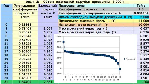 | 3 | Опыт 3: Объем ежегодной вырубки древесины 5 000 т | Равновесие в природе не наступает. Уровень прироста меньше объема вырубки древесины. Через 30 лет лес погибнет. |