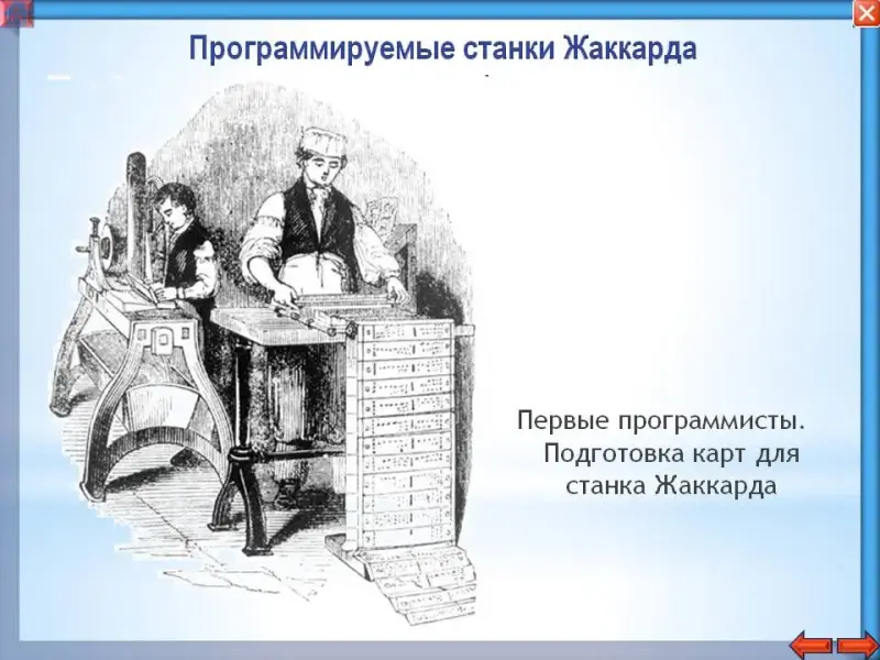 Нить поднималась или опускалась при каждом ходе челнока в зависимости от того, есть отверстие или нет. Поперечная нить могла обходить каждую продольную той Ии иной стороны в зависимости от программы на перфокарте, создавая тем самым затейливый узор из переплетенных нитей. Такое плетение получило название «жаккард» и считается одним из самых сложных и запутанных плетений. Такой ткацкий станок, работающий по программе, был первым массовым промышленным устройством и считается одним из самых совершенных машин, когда-либо созданных человеком.