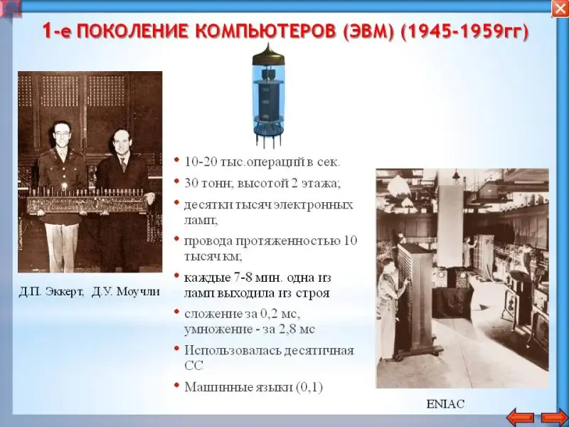I поколение ЭВМ: В 30-х годах 20-го века в развитии физики произошел прорыв, коренной переворот. В вычислительных машинах стали использоваться уже не колеса, валики и реле, а вакуумные электронные лампы. Переход от электромеханических элементов к электронным сразу увеличил быстродействие машин в сотни раз. Первая действующая ЭВМ была построена в США в 1945 году, в университете штата Пенсильвания учеными Эккертом и Моучли и называлась ЭНИАК. Эта машина была построена по заказу министерства обороны США для средств ПВО, для автоматизации управления. Чтобы правильно рассчитать траекторию и скорость движения снаряда для поражения воздушной цели, надо было решить систему из 6-ти дифференциальных уравнений. Эту задачу и должна была решать первая ЭВМ. Первая ЭВМ занимала два этажа одного здания, весила 30 тонн и состояла из десятков тысяч электронных ламп, которые соединялись проводами, общая протяженность которых составляла 10 тысяч км. Когда ЭВМ ЭНИАК работала, электричество в городке отключалась, так много электричества потреблялось этой машиной, электронные лампы быстро перегревались и выходили из строя. Целая группа студентов занималась только тем, что непрерывно искала и заменяла перегоревшие лампы.