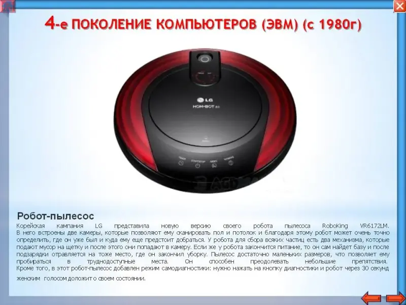 На уроке мы будем работать с помощью мультимедийной презентации, состоящей из 4-х разделов «Предыстория компьютеров», «Поколения компьютеров», «Галерея учёных», «Компьютерный словарь». В каждом разделе есть подраздел «Проверь себя» - это тест, в котором вы сразу узнаете результат.