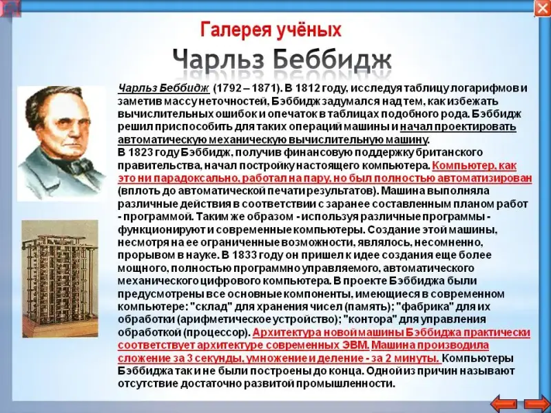 В начале 19-го века английский математик Чарльз Беббидж, занимавшийся составлением таблиц для навигации, разработал ПРОЕКТ вычислительной «аналитической» машины, в основе которого лежал ПРИНЦИП ПРОГРАММНОГО УПРАВЛЕНИЯ (ППУ). Новаторская мысль Беббиджа была подхвачена и развита его ученицей Адой Лавлейс, дочерью поэта Джорджа Байрона - которая стала первой программисткой в мире. Однако практическая реализация проекта Беббиджа была невозможной из-за недостаточного развития промышленности и техники.