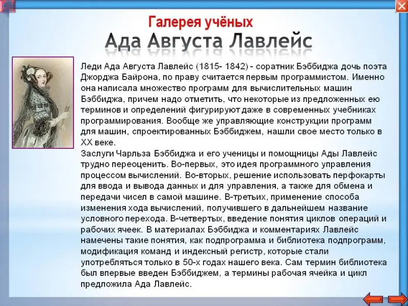 Интересным историческим фактом является то, что первую программу для аналитической машины написал Ада Августа Лавлейс - дочь великого английского поэта Джорджа Байрона. Именно Беббидж заразил ее идеей создания вычислительной машины.
