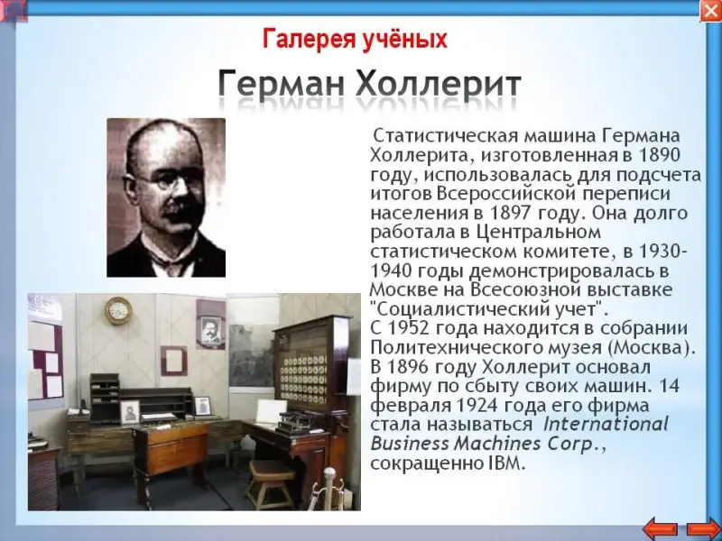 Герман Холлерит родился 29 февраля 1860 года в американском городе Буффало в семье немецких эмигрантов. Герману легко давались математика и естественные науки, и в 15 лет он поступил в Горную школу при Колумбийском университете. На способного юношу обратил внимание профессор того же университета и пригласил его после окончания школы в возглавляемое им национальное бюро по переписи населения. Перепись населения производилась каждые десять лет. Население постоянно росло, и ее численность в США к тому времени составляло около 50 миллионов человек. Заполнить на каждого человека карточку вручную, а затем подсчитать и обработать результаты, было практически невозможно. Этот процесс затянулся на несколько лет, почти до следующей переписи. Необходимо было найти выход из этой ситуации. Герману Холлериту идею механизировать этот процесс подсказал доктор Джон Биллингс, возглавлявший департамент сводных данных. Он предложил использовать для записи информации перфокарты. Свою машину Холлерит назвал табулятором и в 1887 году он был опробован в Балтиморе. Результаты оказались положительными, и эксперимент повторили в Сент-Луисе. Выигрыш во времени был почти десятикратным. Правительство США сразу же заключило с Холлеритом контракт на поставку табуляторов, и уже в 1890 году перепись населения прошла с использованием машин. Обработка результатов заняла менее двух лет и сэкономила 5 миллионов долларов. Система Холлерита не только обеспечивала высокую скорость, но и позволяла сравнить статистические данные по самым разным параметрам. Холлерит разработал удобный клавишный перфоратор, позволяющий пробивать около 100 отверстий в минуту одновременно на нескольких картах, автоматизировал процедур подачи и сортировки перфокарт. Сортировку осуществляло устройство в виде набора ящиков с крышками. Перфокарты продвигались по своеобразному конвейеру. С одной стороны карты находились считывающие штыри на пружинках, с другой - резервуар с ртутью. Когда штырь попадал в отверстие на перфокарте, то благодаря ртути, находящейся на другой стороне, замыкал электрическую цепь. Крышка соответствующего ящика открывалась и туда попадала перфокарта. Табулятор использовали для переписи населении в нескольких странах.