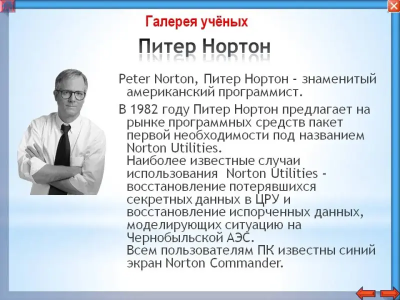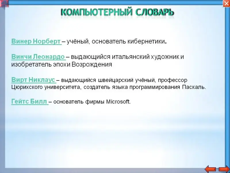 Для разработки программ для ЭВМ создавались различные языки программирования (алгоритмические языки). Фортран FORTRAN - FORmula TRANslated - первый язык , создан в 1956 году Дж. Бэкусом. В 1961 году появился Бейсик BASIC (Beginners All-purpose Simbolic Instartion Code -многоцелевой язык символических инструкций для начинающих) Т.Куртц, дж. Кемени.В 1971 году профессор Цюрихского университета Николас Вирт создал язык Паскаль Pascal, который назвал в честь ученого Блеза Паскаля. Создавались и другие языки: Ада, Алгол, Кобол, Си, Пролог, Фред, Лого, Лисп и др. Но до сих пор самым популярным языком программирования является Паскаль, многие более поздние языки взяли из Паскаля основные команды и принципы построения программы, например язык Си, Си+ и система программирования Delphi, даже Бейсик, изменившись позаимствовал из Паскаля его структурированность и универсальность. Мы с вами в 11-ом классе будем изучать язык Паскаль и научимся создавать программы для решения задач с формулами, для обработки текста, научимся рисовать и создавать движущиеся рисунки.