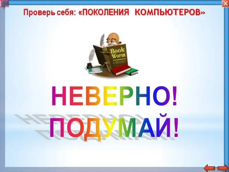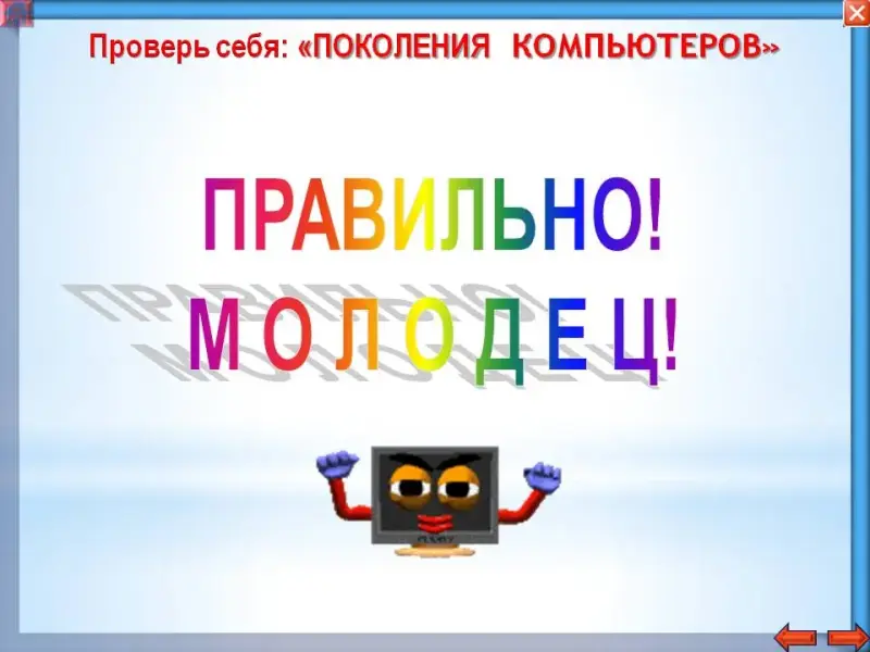 Закрепление нового материала возможно с помощью теста в мультимедийной презентации к уроку: раздел «Проверь себя» в каждой части презентации: «Предыстория компьютеров», «Поколения ЭВМ», «Галерея учёных».