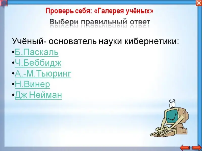 Проверка знаний по данной теме возможно с помощью тестов «История вычислительной техники» (Приложение 1) в 4-х вариантах и тест об учёных «Информатика в лицах» (Приложение 2)