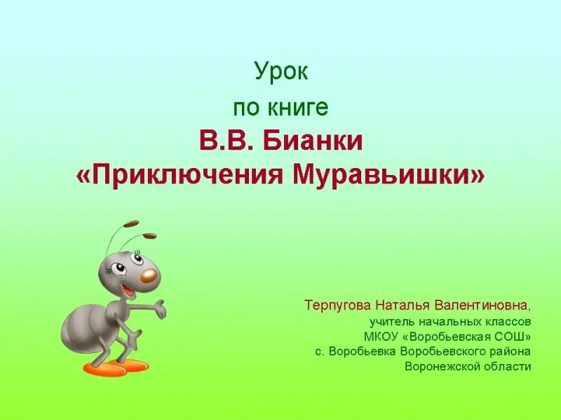 И поможет нам в этом книга «Приключения Муравьишки», которую написал… (В.В. Бианки)