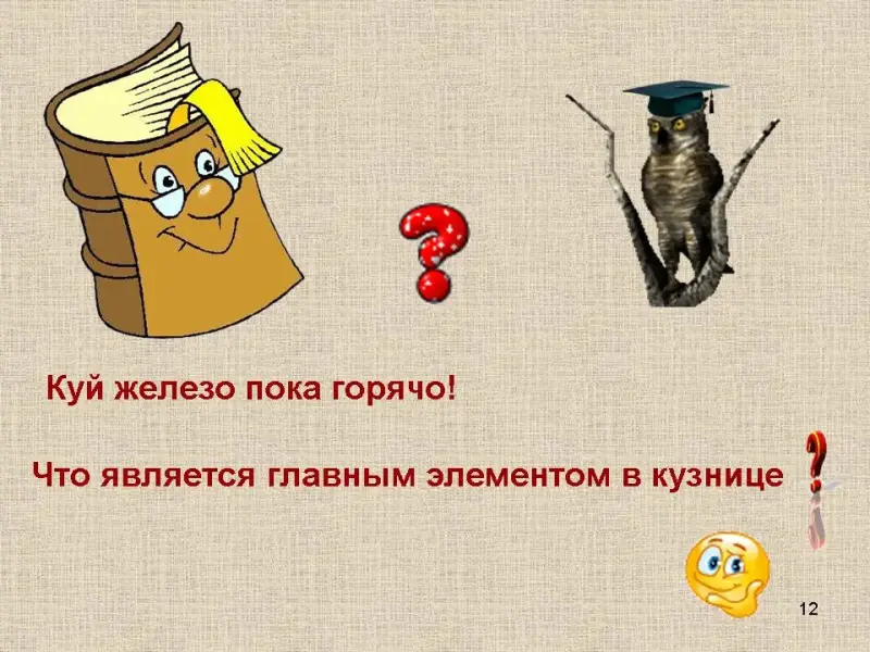 Слайд 12. На экране слайд со словами «Куй железо, пока горячо!»