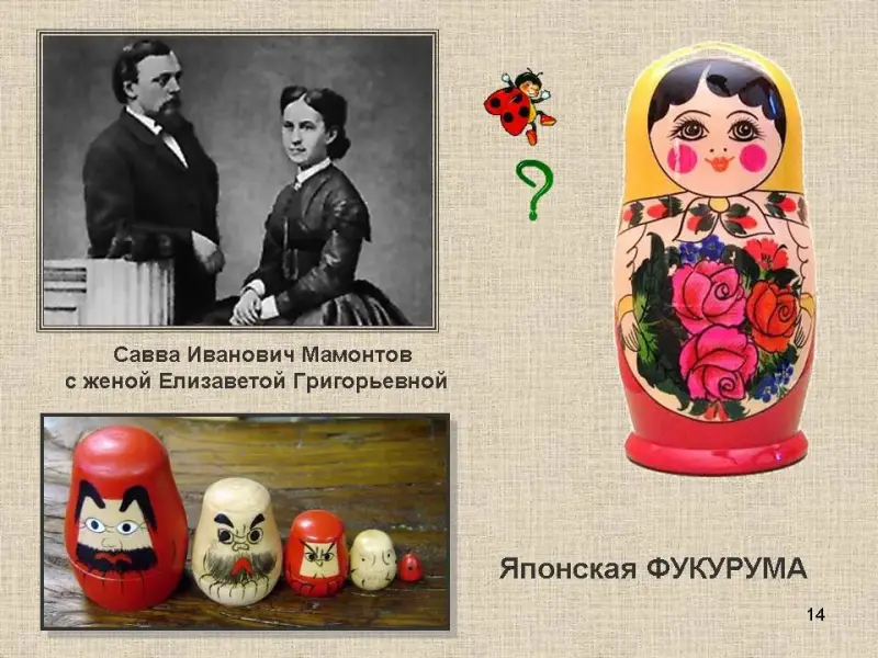 Вед.2 А теперь задание потруднее…. Вы сейчас скажете «ну и что же здесь такого трудного»? Кто из вас расскажет, как появилась на свет русская матрёшка? (Дети рассказывают, а если не рассказывают , то рассказывает ведущий ) По щелчку на этом слайде появляется фотография Саввы Мамонтова с женой Елизаветой Григорьевной и фотография японской игрушки.