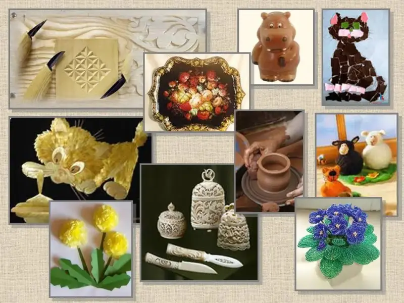 Вед.1 Народных промыслов существует великое множество - столько же, сколько есть природных материалов, для создания самых разных предметов. Это и дерево, и глина, и кость, и металл, и ткани, и шерстяные и шелковые нити, и солома, и….!!! Ну всё, почти всё годится, чтобы человеческие руки сделали из этого нечто оригинальное и даже прекрасное! Многие народные промыслы насчитывают столетия, а многие родились совсем недавно. Мы знаем, что вы привезли сегодня много чудесных вещей, придуманных и сделанных своими руками.