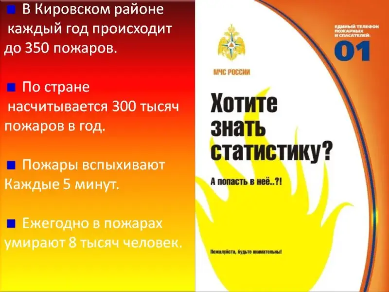1 спасатель: В нашем Кировском районе каждый год происходит до 350 пожаров, особенно в жару и зимние праздники. (слайд №11).