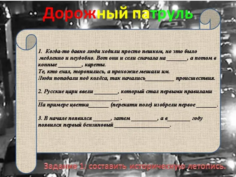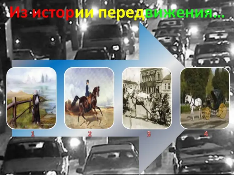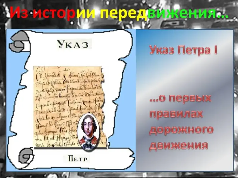 а) Когда-то давно люди ходили просто пешком, но это было медленно и неудобно. Вот они и сели сначала на лошадь, а потом в конные повозки, кареты. Те, кто ехал, торопились, а прохожие мешали им. Кучер покрикивал на прохожих и разгонял их кнутами. А тот, кто не смог увернуться, попадал под копыта лошадей. Так начались дорожно-транспортные происшествия. Не понравилось это русским царям. Решили они издать указ, который и стали, потом считать первыми правилами дорожного движения. (слайд 5).