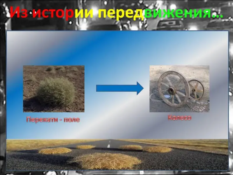 б) Первые деревянные, грубые повозки появились во 2-м тысячелетии до н.э. Все началось с колеса. Оно известно примерно с середины 4-го тысячелетия до н. э. (Месопотамия). До этого человек знал, кроме пешего хождения и хождения по морю, еще два вида передвижения - верховую езду и перемещение тяжестей на волокушах из шестов, веток или шкур. Предполагается, что свыше 500 лет тому назад один китайский богдыхан обратил внимание на цветок венчика ветреницы, который под воздействием ветра перекатывался по полю. Так появилось колесо. (слайд 6).