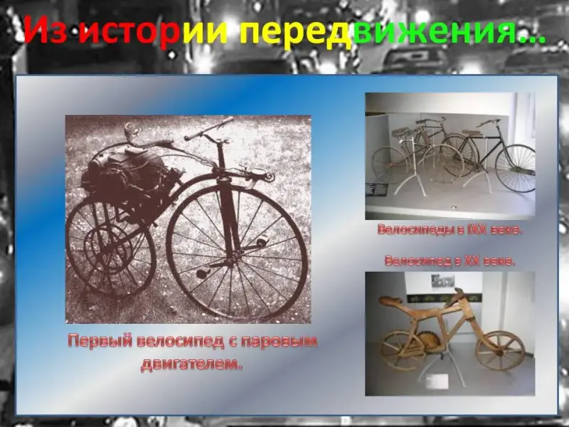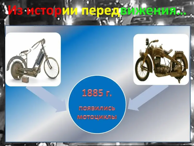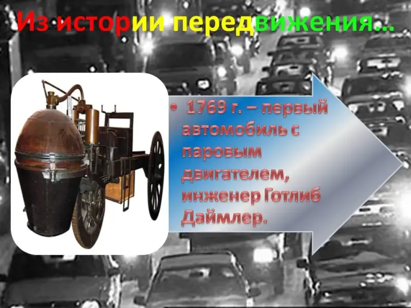 в) Автомобили появились в 1769 году, но они были с паровым двигателем (слайд 7), затем появился велосипед (слайд 8), а первый мотоцикл появился в 1885 году благодаря немецкому инженеру Готлибу
