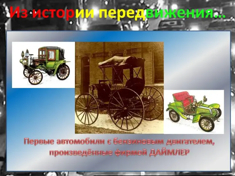 Даймлеру, у него был уже бензиновый двигатель (слайд 9). Автомобиль с бензиновым двигателем появился несколько позже, то есть тот же немец Готлиб его сконструировал в 1887 году. (слайд 10).