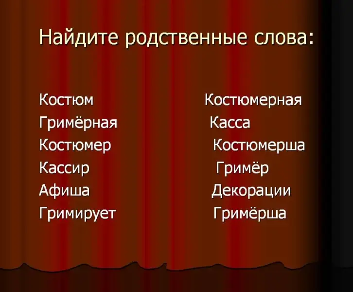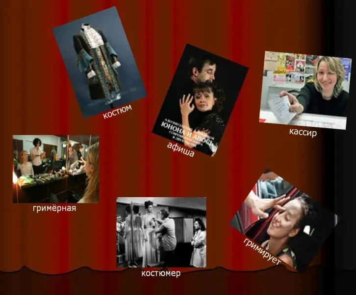 Речевой материал: кос-тюм, кос-тю-мер, кос-тю-мер-ша, кос-тю-мер-на-я, гри-мёр, гри-мёр-ша, гри-мёр-на-я, гри-ми-ру-ет, кас-са, кас-сир, а-фи-ша, де-ко-ра-ци-и.