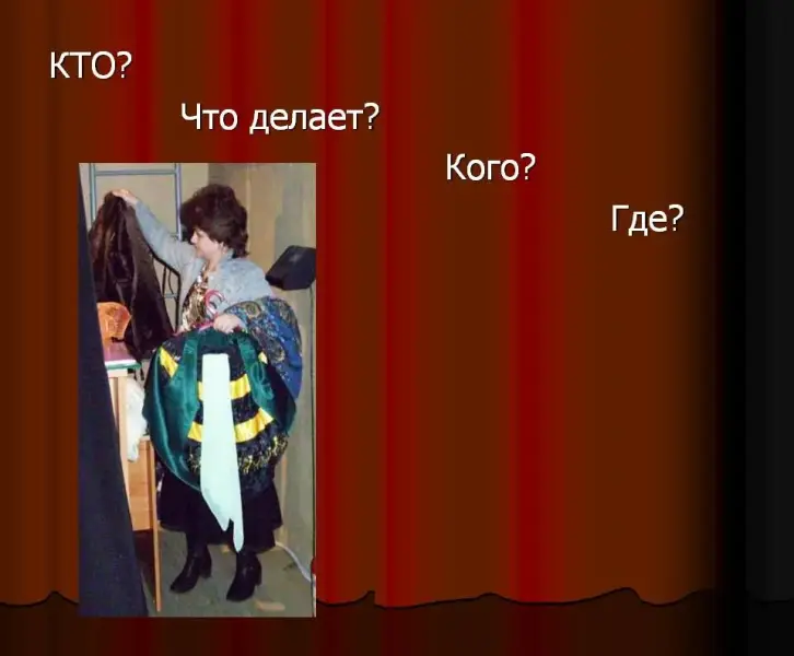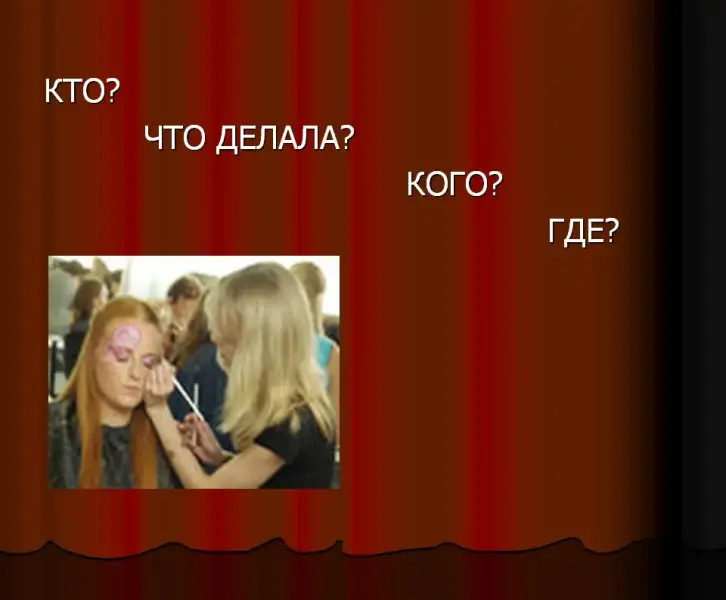 | Кто? Что делала? Кого? Где? | Гримёрша гримировала артиста в гримёрной перед спектаклем. |