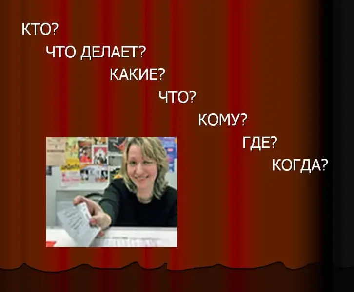 | Кто? Что делает? Какие? Что? Кому? Где? Когда? | Кассир продаёт театральные билеты зрителям в кассе перед спектаклем. |