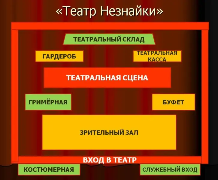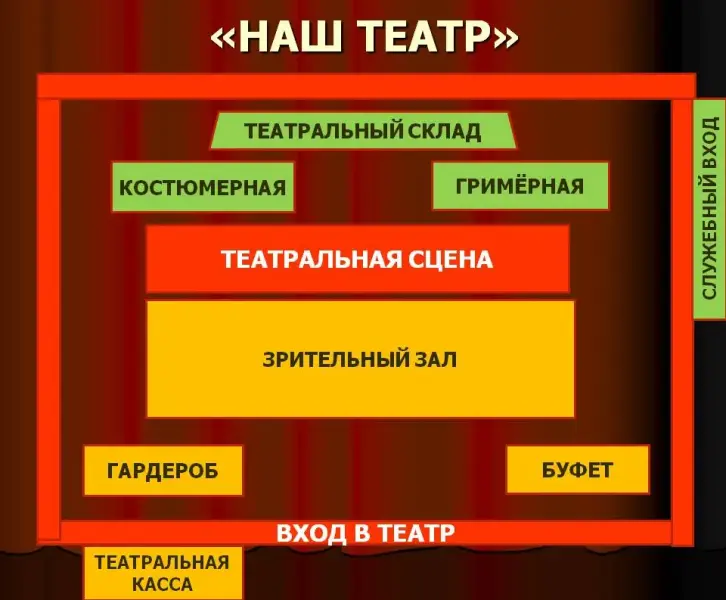 (В презентации на слайде 13 схематичное изображение театра с неправильным расположением театральных помещений относительно сцены.)