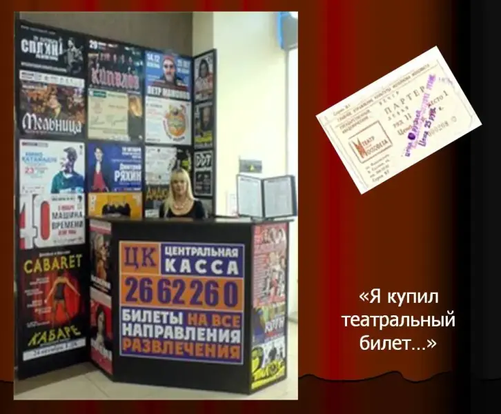 - Предлагаю вам, ребята, представить себя кассиром в театральной кассе, посетителями театра, людьми в очереди за билетами, афишей в фойе, другими героями и придумать сценку «Я купил театральный билет…».
