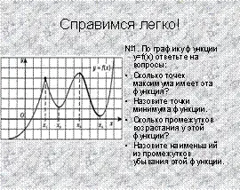 Алгебра, 10 класс, тема «Применение производной для исследования функции» в ходе устной работы были предложены задания, позволяющие показать недостаточность знаний для определения свойств функции по графику её производной.