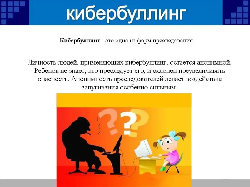 Личность людей, применяющих кибербуллинг, остается анонимной. Ребенок не знает, кто преследует его, и склонен преувеличивать опасность. Анонимность преследователей делает воздействие запугивания особенно сильным.