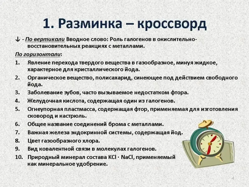 I. Разминка - химический кроссворд по теме «Галогены» (3 минуты).