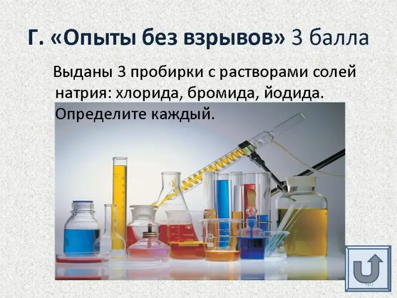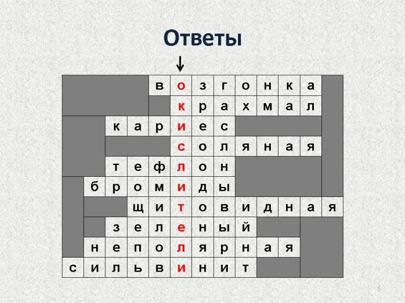 1 - возгонка, 2 - крахмал, 3 - кариес, 4 - соляная, 5 - тефлон, 6 - бромиды, 7 - щитовидная, 8 - зеленый, 9 - неполярная, 10 - сильвинит.