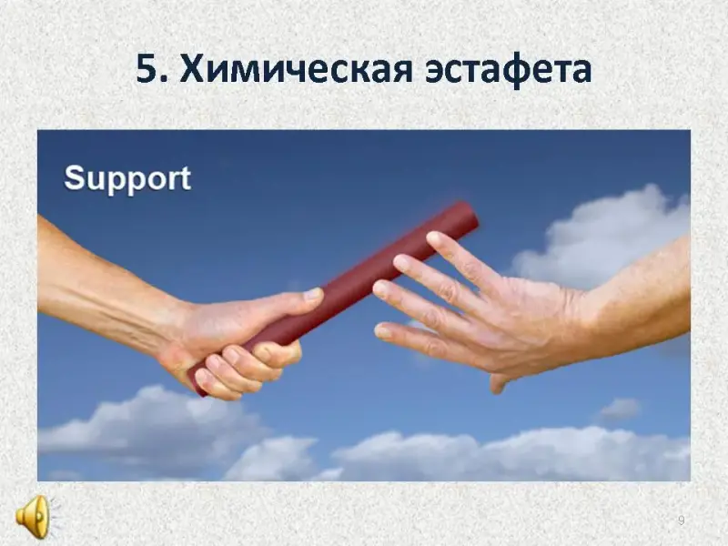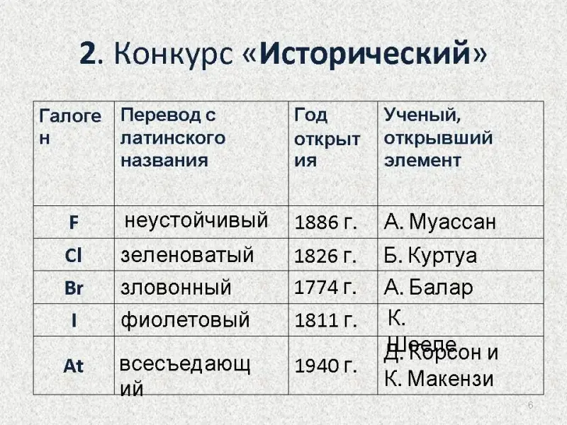 Командам выдаются карточки с началами уравнений реакций, характеризующих химические свойства галогенов. Участники распределяют их между собой (30 секунд) и записывают полные уравнения на доске по очереди, передавая друг другу мел как эстафетную палочку. В целях экономии времени можно левые части уравнений заранее написать на доске. Каждое правильное уравнение приносит команде 1 балл, всего 5 баллов + 2 балла за скорость. (Неправильно расставленные коэффициенты при правильно составленных формулах продуктов реакции снижают балл на 0,5)