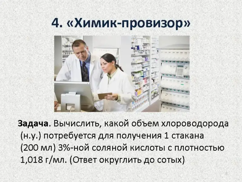 Итак, соляная кислота - жизненно необходимое вещество. Значительная часть поваренной соли, которой человек употребляет в пищу, расходуется организмом именно на синтез этой кислоты. К сожалению, у некоторых людей наблюдается её нехватка, поэтому процессы пищеварения нарушены. Врачи вынуждены прописывать её как лекарство (3%-ный раствор). Ваша задача - вычислить, какой объем хлороводорода (н.у.) потребуется для получения 1 стакана (200 мл) такой кислоты с плотностью 1,018 г/мл. (Ответ округлить до сотых)