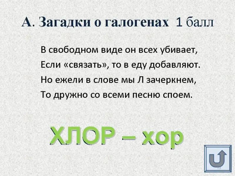 В свободном виде он всех убивает, Если «связать», то в еду добавляют. Но ежели в слове мы Л зачеркнем, То дружно со всеми песню споем. (хлор - хор) |