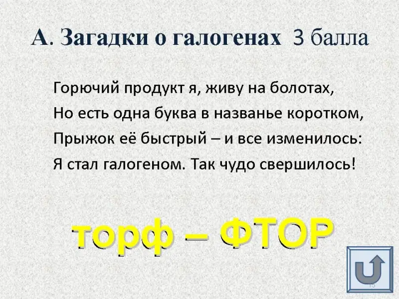 Горючий продукт я, живу на болотах, Но есть одна буква в названье коротком, Прыжок её быстрый - и все изменилось: Я стал галогеном. Так чудо свершилось! (торф - фтор) |
