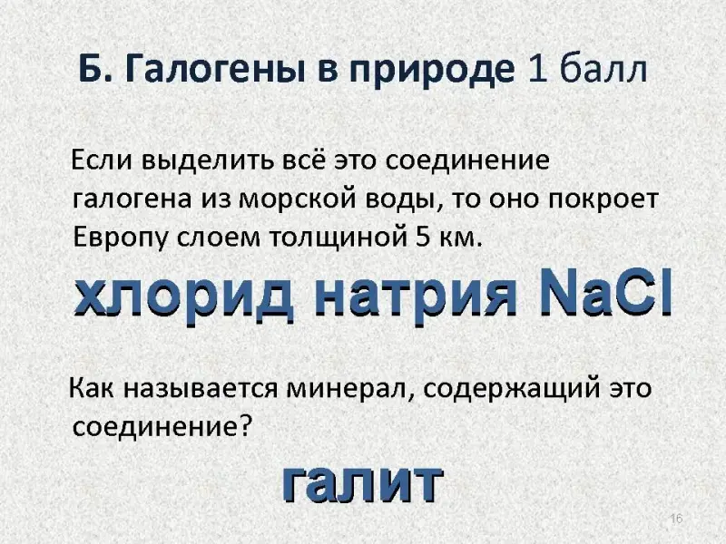Если выделить всё это соединение галогена из морской воды, то оно покроет Европу слоем толщиной 5 км. Назовите это соединение и его химическую формулу.
