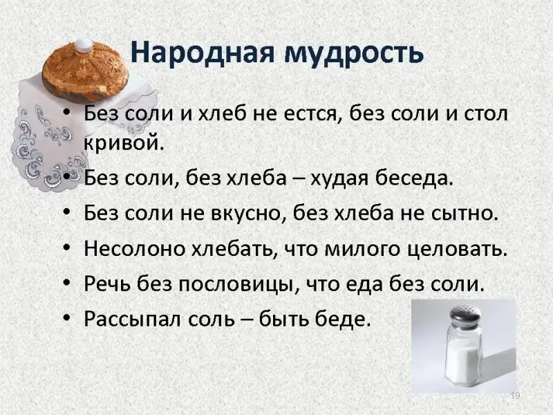 Учитель рассказывает о необходимости применения поваренной соли. Об этом говорится и в художественных произведениях, например «Как казаки соль покупали» (Слайд 18). Соль играет важную роль в жизнедеятельности организма. В теле человека, весящего 70 кг, содержится более 150 г соли, запас которой расходуется и нуждается в ежедневном пополнении - около 20 грамм. В год человек съедает 6-8 кг соли, так что «пуд соли съесть» вдвоём можно как раз за один год и хорошо друг друга узнать. Есть и другие поговорки и пословицы, связанные с важной ролью соли. (Слайд 19)