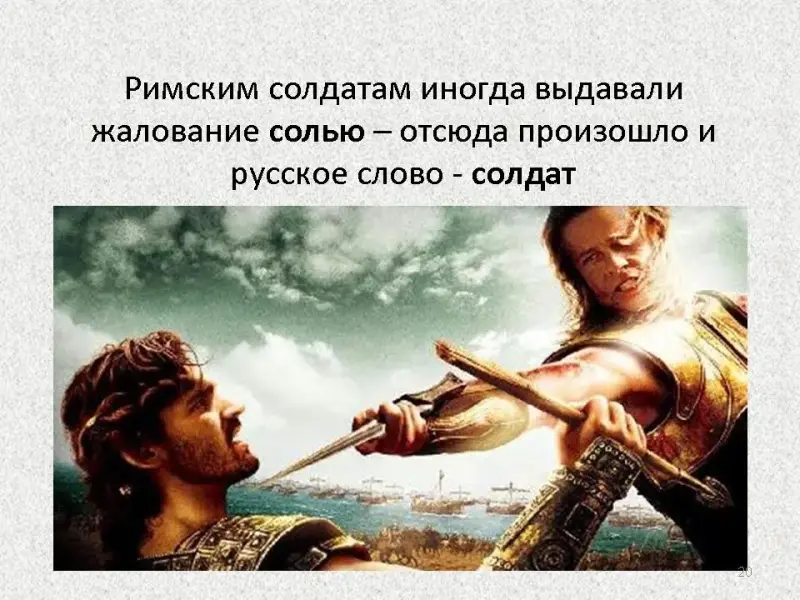 Римским солдатам иногда выдавали жалование солью - отсюда произошло и русское слово - солдат. (Слайд 20) Знаменитый итальянский путешественник 12 века Марко Поло рассказывал о том, как в Китае изготовляли деньги из соли. «Для этого,- писал Марко Поло,- рассол кипятился в небольших котлах. Через час соль принимает вид теста, из него делают нечто вроде пирожков…» После того как на «пирожки» накладывают клеймо императора, чтобы они уподобились настоящим, металлическим, монетам, их «зажаривают» на горячих черепицах.