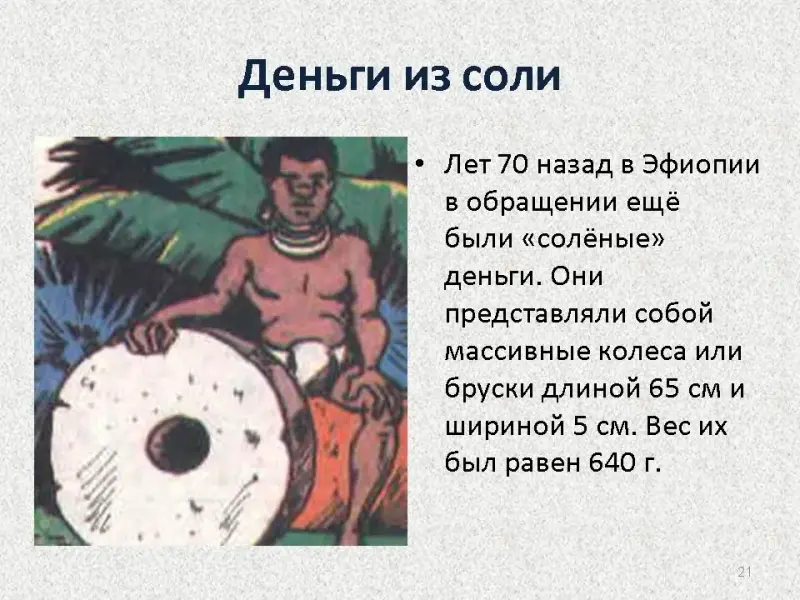 В некоторых районах Африки, очень бедных солью, обыкновенная поваренная соль ещё недавно ценилась так высоко, что за килограмм соли давали килограмм золота. Лет 70 назад в Эфиопии в обращении ещё были «солёные» деньги. Они представляли собой бруски длиной 65 см и шириной 5 см. Вес их был равен 640 г. Иногда эти своеобразные монеты делились на четыре части. Были в ходу и деньги в виде массивных колёс из соли. (Слайд 21)
