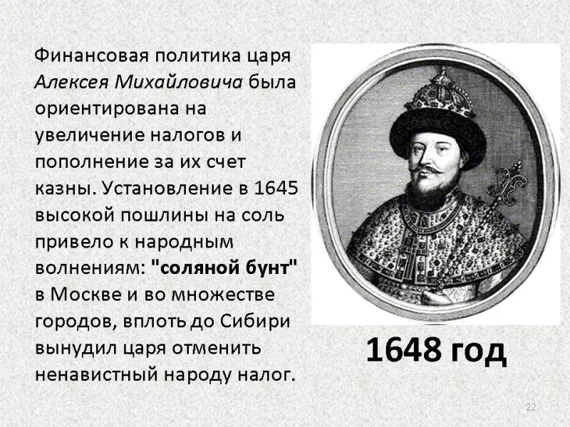 В Киевской Руси пользовались солью из Прикарпатья и из соленых озер и лиманов на Руссом (ныне Черном) и Сурожским (Азовским) морях. После присоединения Астраханского края к Московскому государству важными источниками соли стали озера Прикаспия. Здесь впервые солепромышленникам не приходилось "варить" соль, ее просто сгребали со дна озер и отправляли на судах вверх по Волге. И все же потребность в соли не удовлетворялась. Соль обходилась так дорого, что на торжественных пирах ее подавали лишь на столы знатных гостей, прочие же расходились с торжества " не солоно хлебавши". От нехватки и дороговизны соли больше всего страдали беднейшие слои населения. Повышение в интересах дворян соляного налога в 1646 г. вызвало движение недовольства низших слоев населения сначала в Москве, затем на юге и в Сибири, потом в Пскове и Новгороде. Это восстание, носившее антифеодальный характер и известное под названием "Соляной бунт" (1648г.), было жестоко подавлено, а соль по-прежнему осталась дорогой и дефицитной. (Слайд 22)