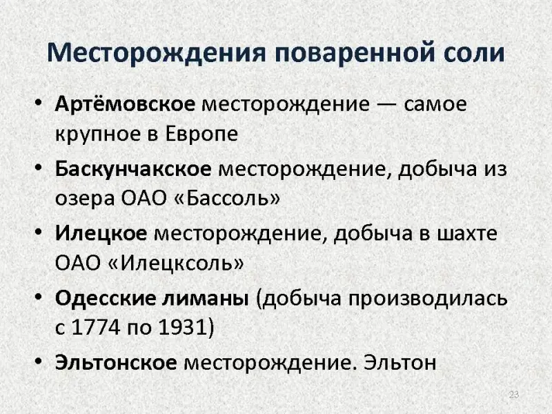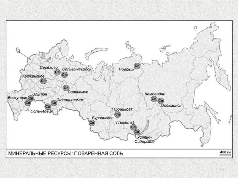 В настоящее время в России разрабатывают различные месторождения поваренной соли (Слайды 23-24):